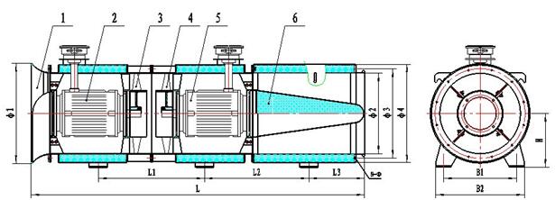 1—集流器 2—Ⅰ级电机 3—Ⅰ级叶轮 4—Ⅱ级叶轮 5—Ⅱ级电机 6—扩散器