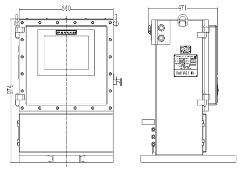 本控制箱主要由主隔爆腔、人机操作液晶触摸屏、进出线接线腔和本安腔组成。上部为主腔和接线腔、下部为本安腔。主隔爆腔采用螺栓紧固式结构,便于设备的安装、调试与维护;主控隔爆箱体内正面安装有PLC模块、下部有电源模块箱。前门面板上有操作按钮和超大的液晶触摸屏,操作界面简单、友好。本安腔内装有语音模块、喇叭和接线端子。