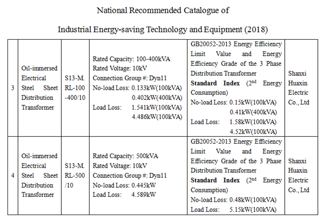 Shanxi Huaxin Electric’s Transformer series have been included into the “National Recommended Catalogue of Industrial Energy-saving Technology and Equipment (2018)” by the Ministry of Industry and Information Technology Department. The recommended catalogue can be found in the below URL: https://www.miit.gov.cn/cms_files/filemanager/oldfile/miit/n1146285/n1146352/n3054355/n3057542/n3057544/c6469714/part/6469790.pdf